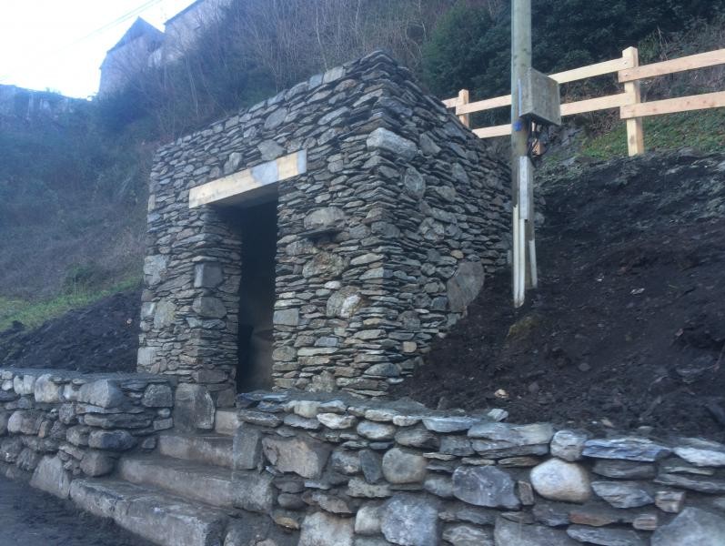La commune de TRAMEZAIGUES a engagé des travaux de réhabilittion et d'embellissement de l'accès piétonnier au village depuis la RD 929. La SOCABAT a réalisé l'habillage en pierres sèches de l'abri bus dans le respect des constructions de ce petit village de montagne.